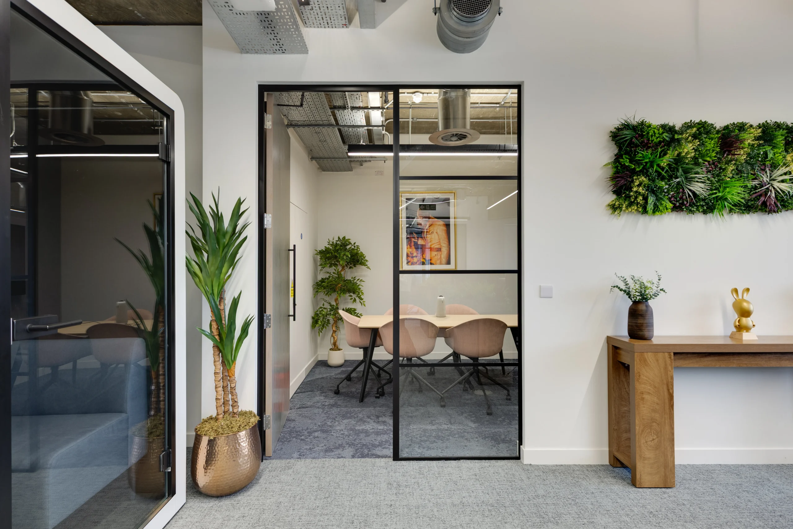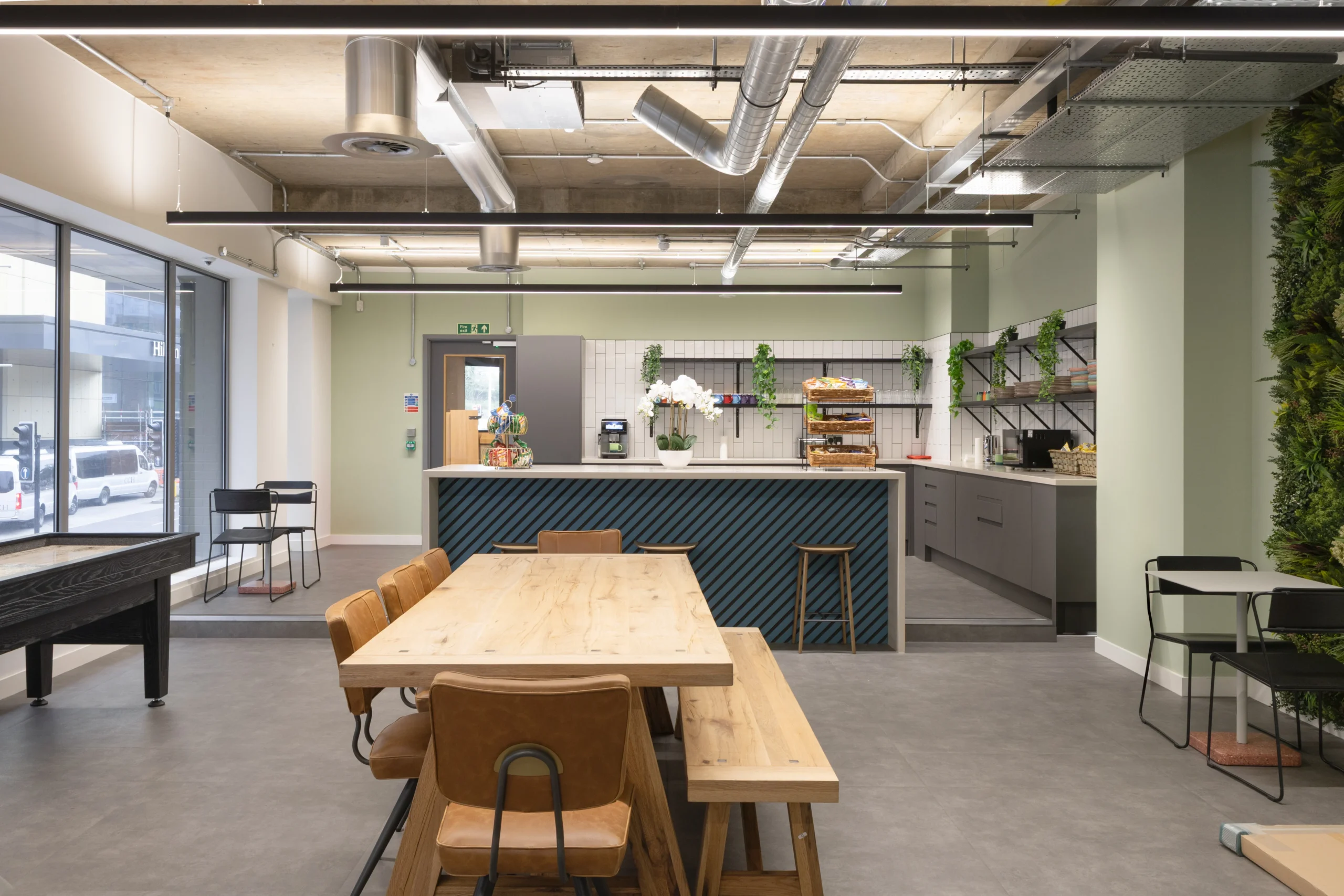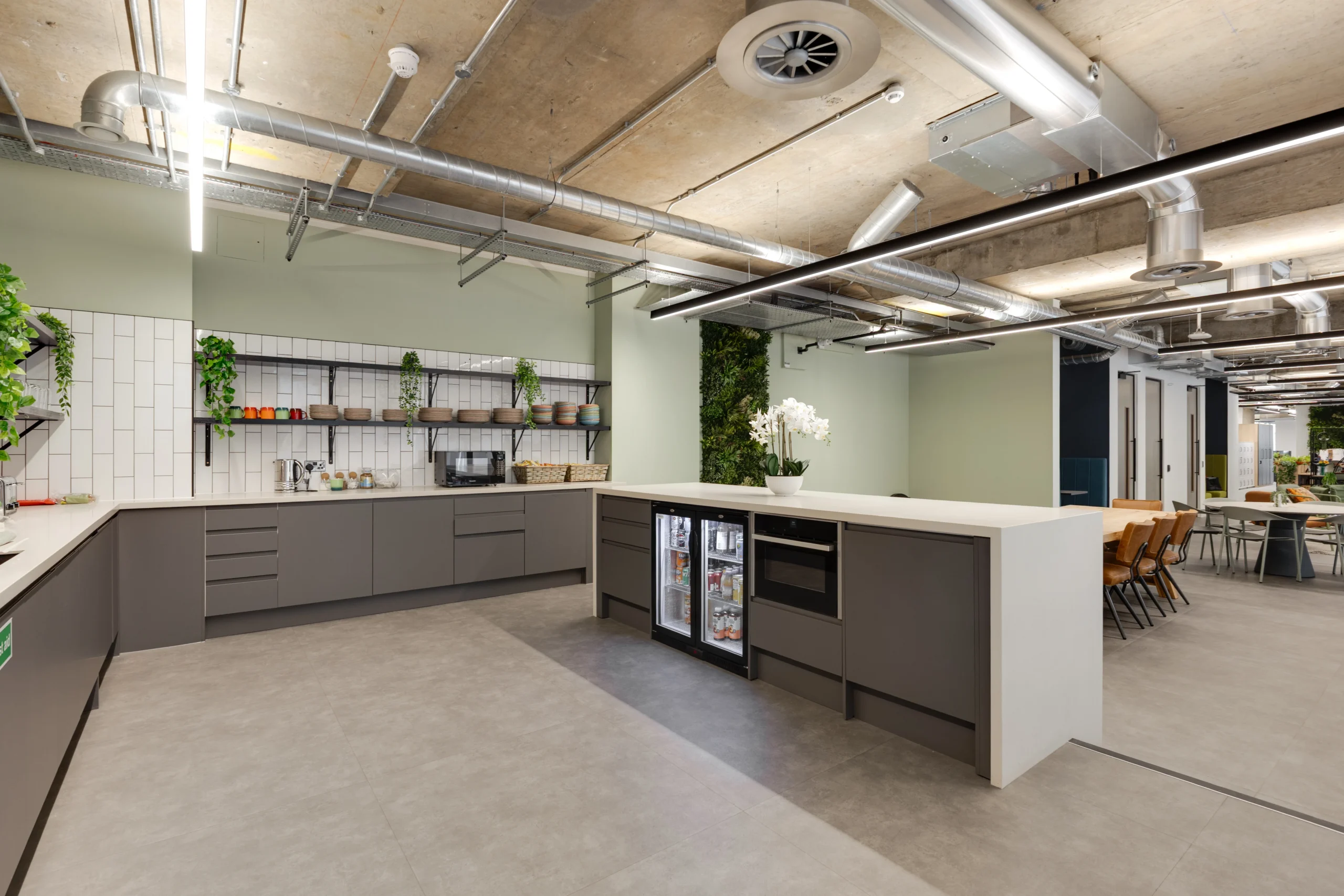 A muted palette of sage green, terracotta and warm neutrals create a relaxed atmosphere, supporting both wellbeing and focus. Frosted glazing was introduced at ground level to provide privacy while maintaining natural light and a sense of openness.
