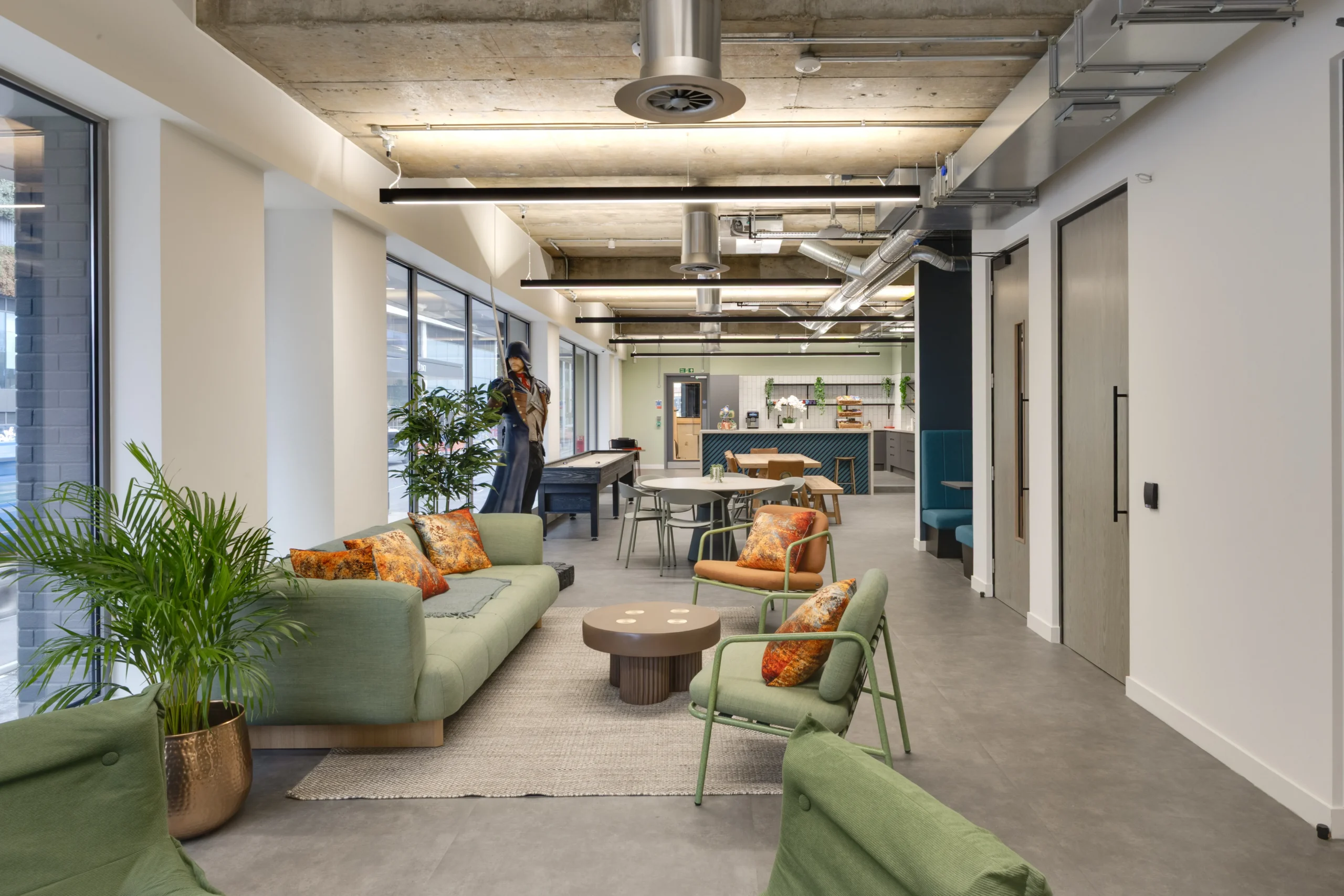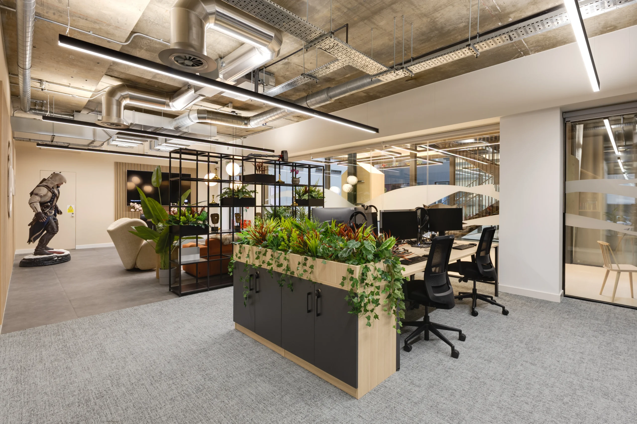 Brand identity is subtle, allowing the space to feel balanced rather than overwhelming. A large Assassin’s Creed statue provides a focal point, while arcade machines, concept art and game clues are integrated into breakout areas as a nod to Ubisoft’s culture.