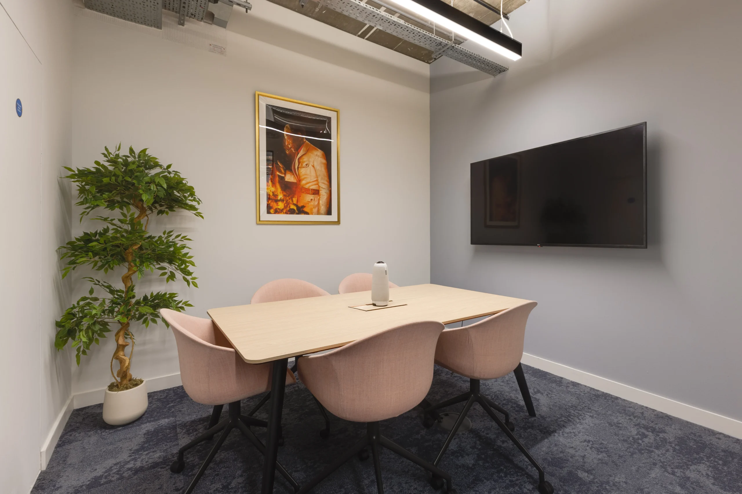 Phonebooth and breakout area at Tech UK, with an island featuring blue high stools Find out more